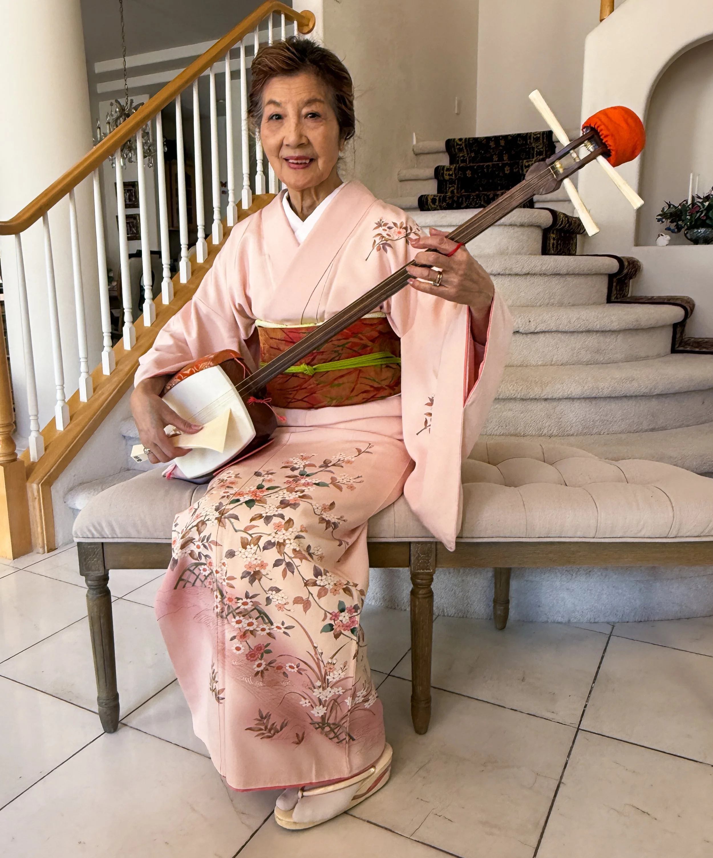 The Sangen: The shamisen or samisen (Japanese: literally “three flavor strings”), also called sangen (literally “three strings”) is a three-stringed musical instrument played with a plectrum called a bachi. Yoko teaches on the nagauta, which produces a sweet sound.